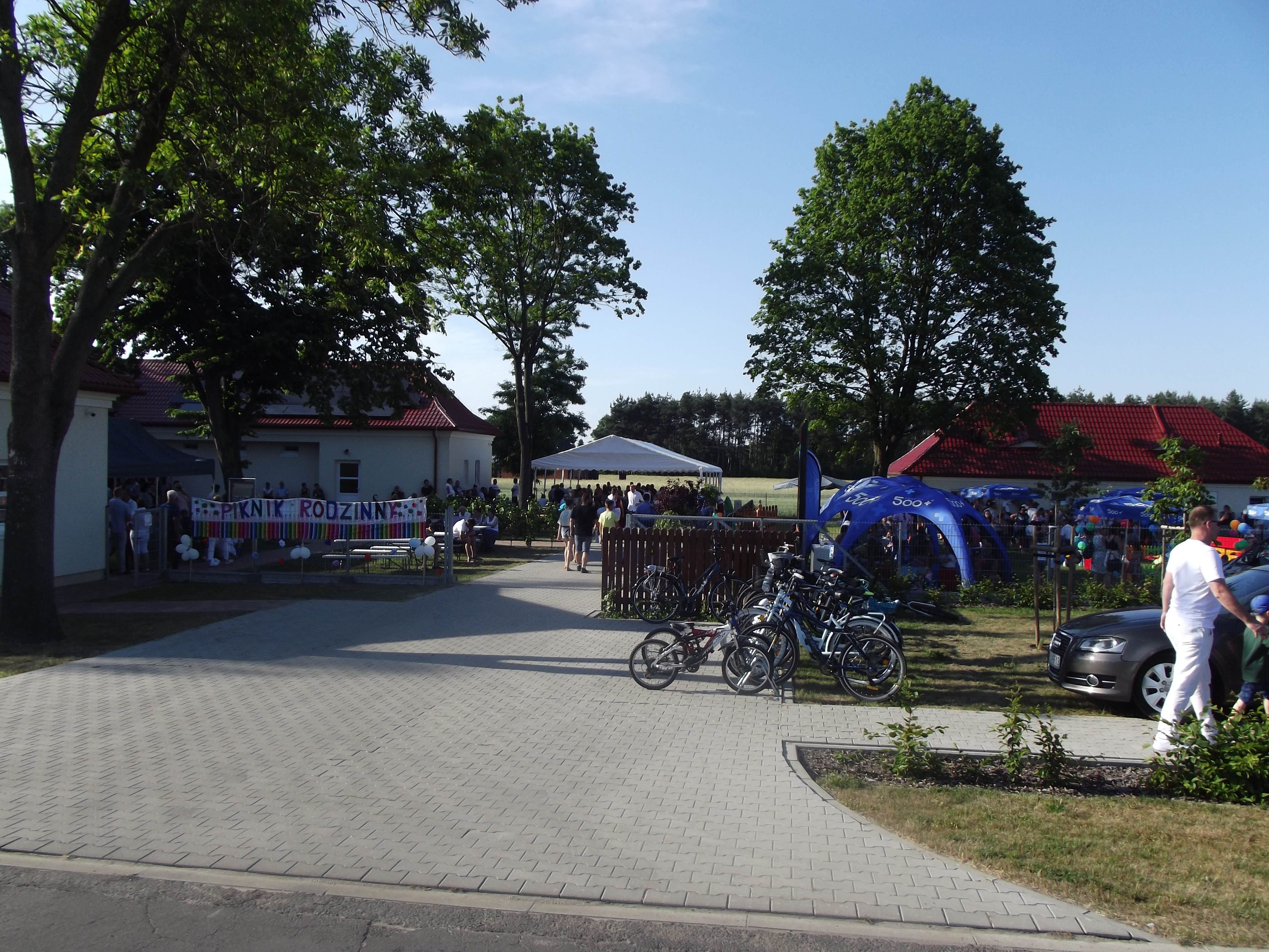 Na ogrodzeniu obiektu zawieszony kolorowy baner z napisem „Piknik Rodzinny”.