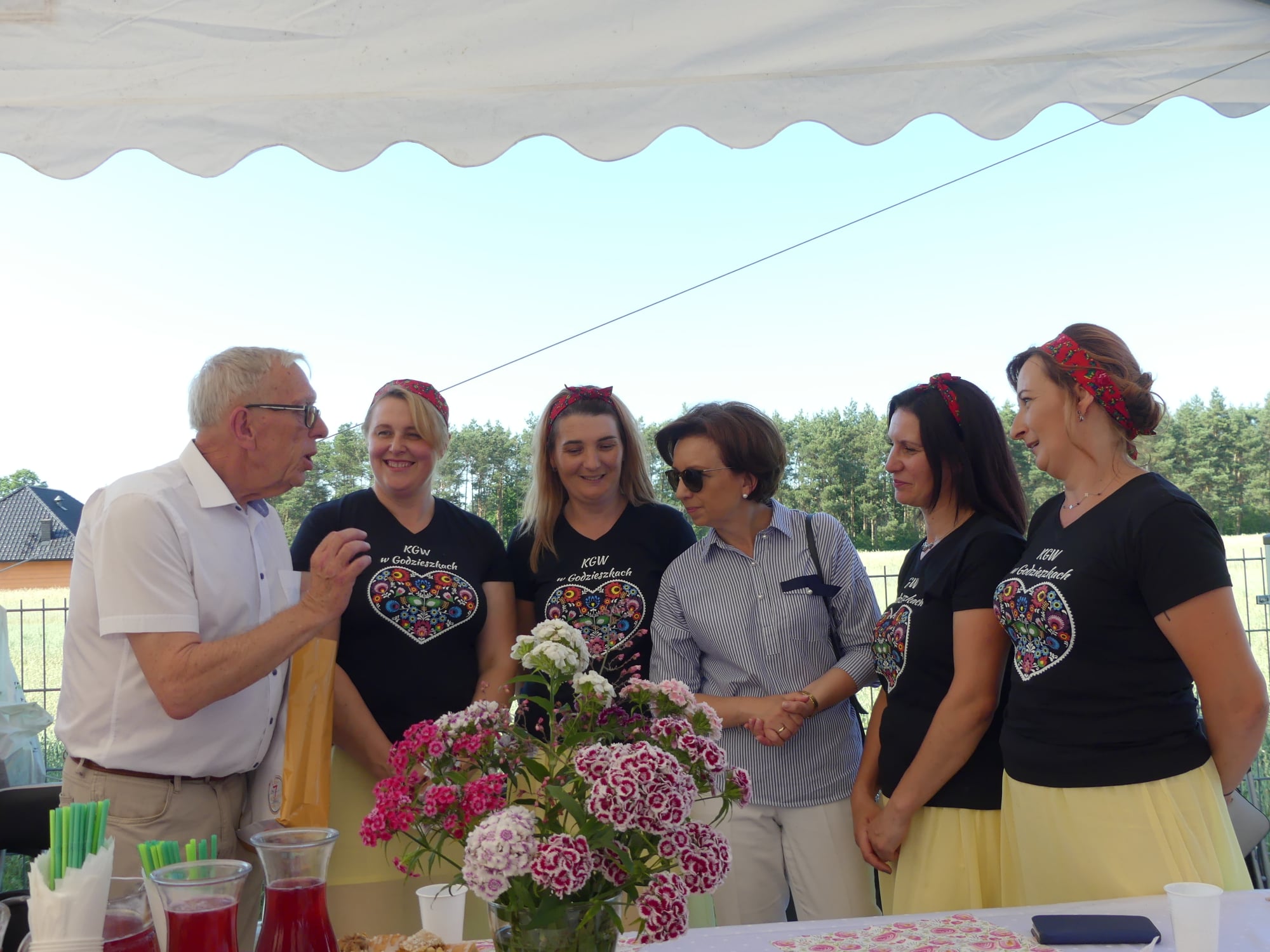 Od lewej strony Józef Podłużny – Wójt Gminy Godziesze Wielkie, Pani Marlena Maląg – Minister Rodziny i Polityki Społecznej wraz z przedstawicielkami Koła Gospodyń Wiejskich „Godzieszki”.