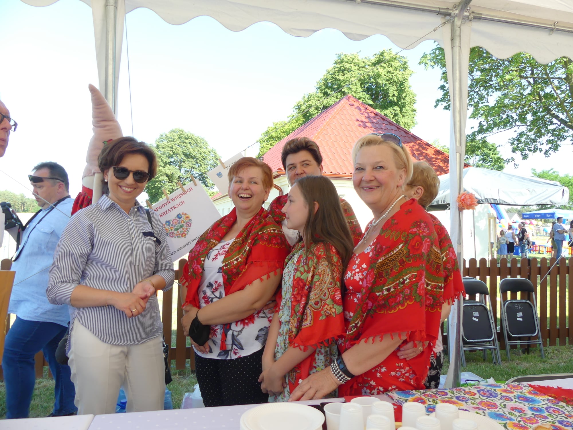 Od lewej strony Pani Marlena Maląg – Minister Rodziny i Polityki Społecznej wraz z przedstawicielkami Koła Gospodyń Wiejskich „Skrzatki”.