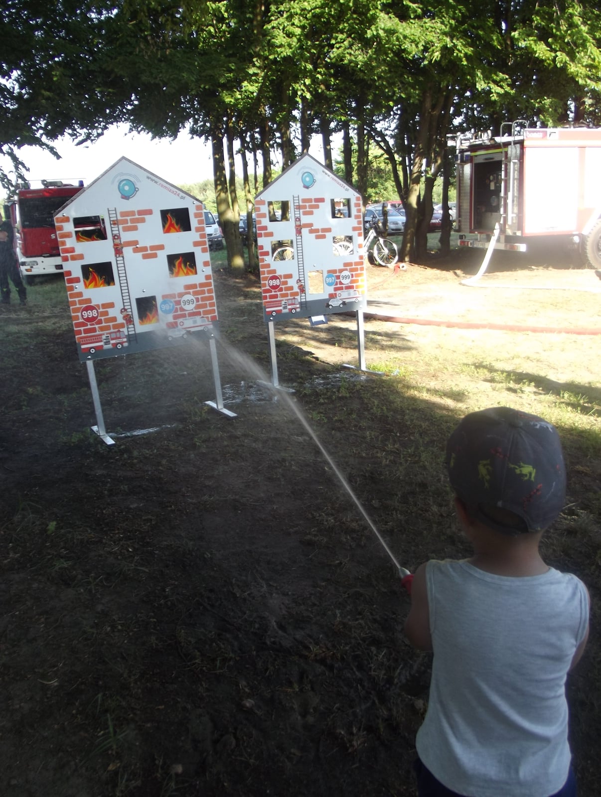 Dziecko kierujące strumień wody w kierunku Makiety Treningowej – „Domek strażacki” w celu przewrócenia płytek , symbolizujących pożar w oknie i drzwiach.