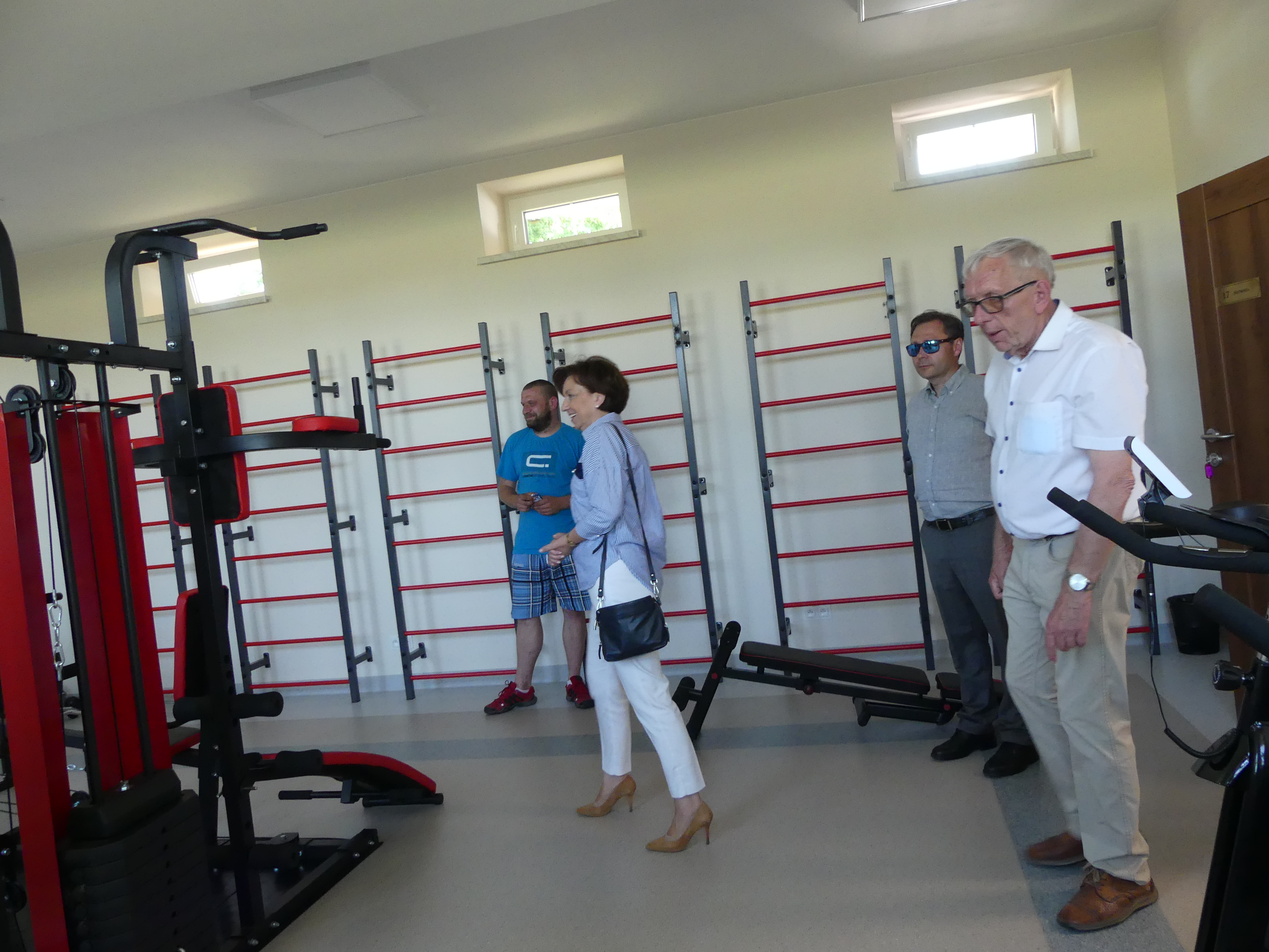 Pani Marlena Maląg – Minister Rodziny i Polityki Społecznej wraz z Józefem Podłużnym – Wójtem Gminy Godziesze Wielkie w siłowni.