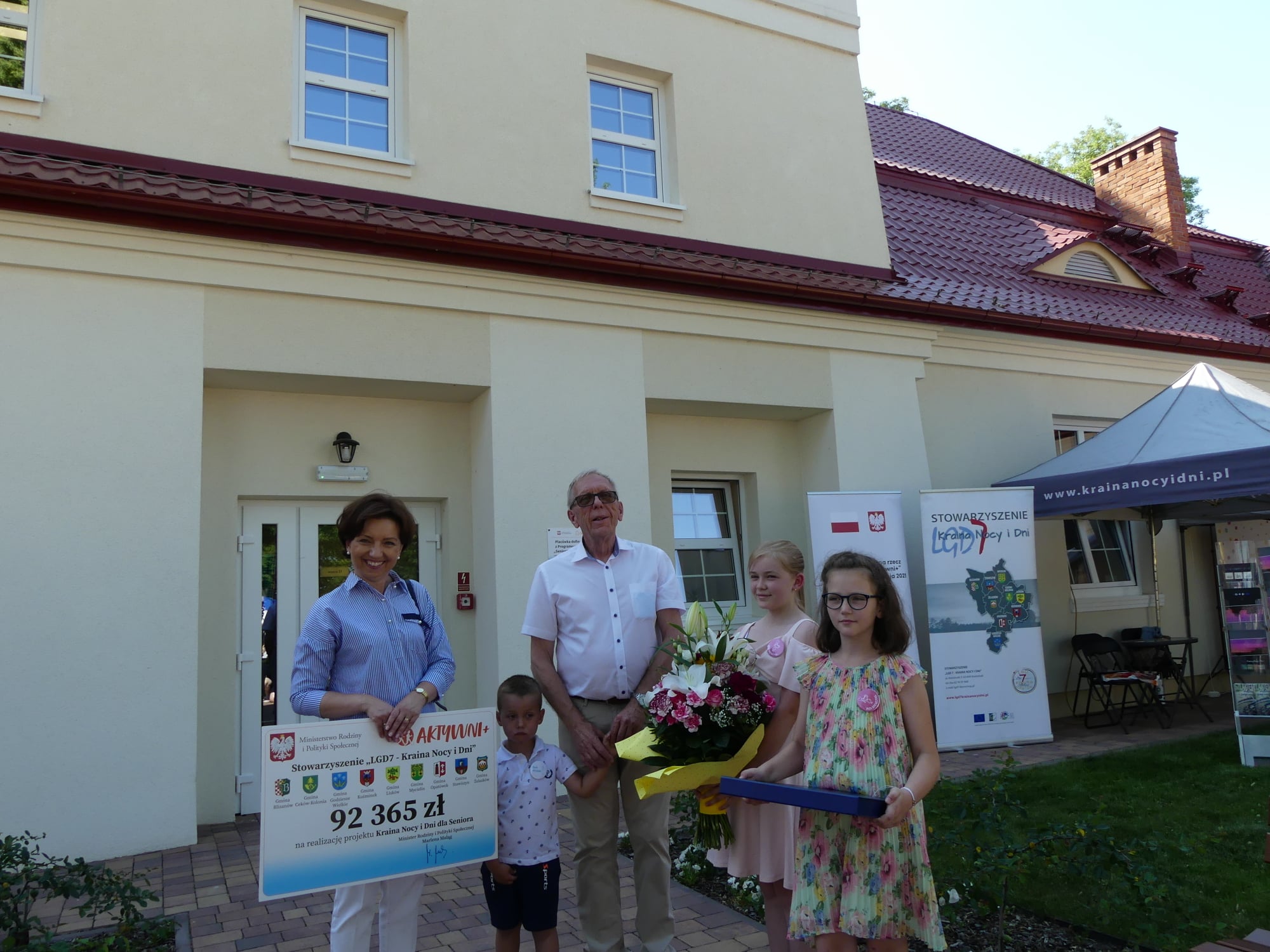 Od lewej strony Pani Marlena Maląg – Minister Rodziny i Polityki Społecznej Józef Podłużny – Wójt Gminy Godziesze Wielkie oraz dzieci wręczające kwiaty i tablicę „Przyjaciel Gminy”.