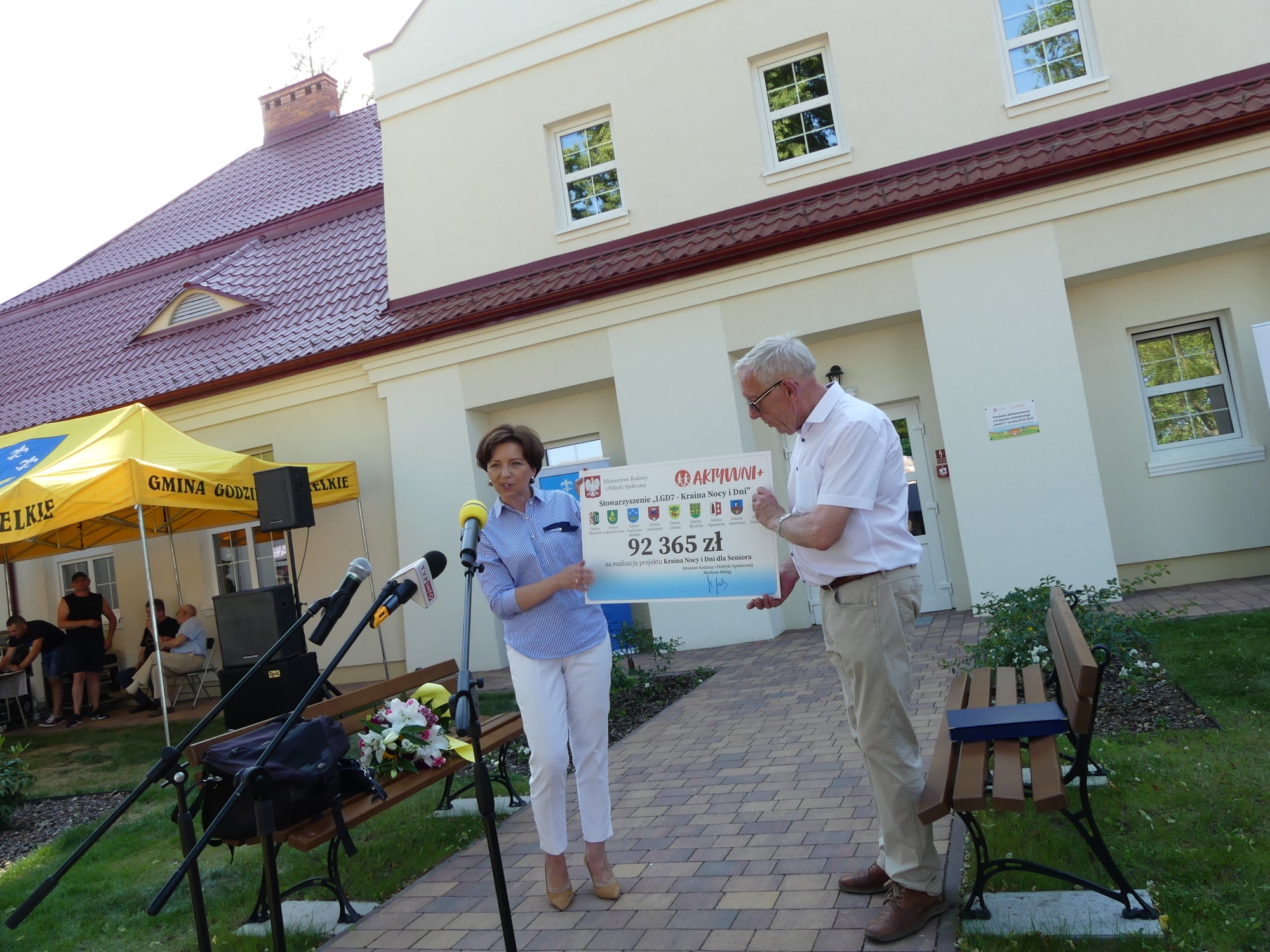 Pani Marlena Maląg – Minister Rodziny i Polityki Społecznej przekazująca promesę na realizację projektu „Edukacja dla Seniora w Krainie Nocy i Dni” Wójtowi Gminy Godziesze Wielkie.