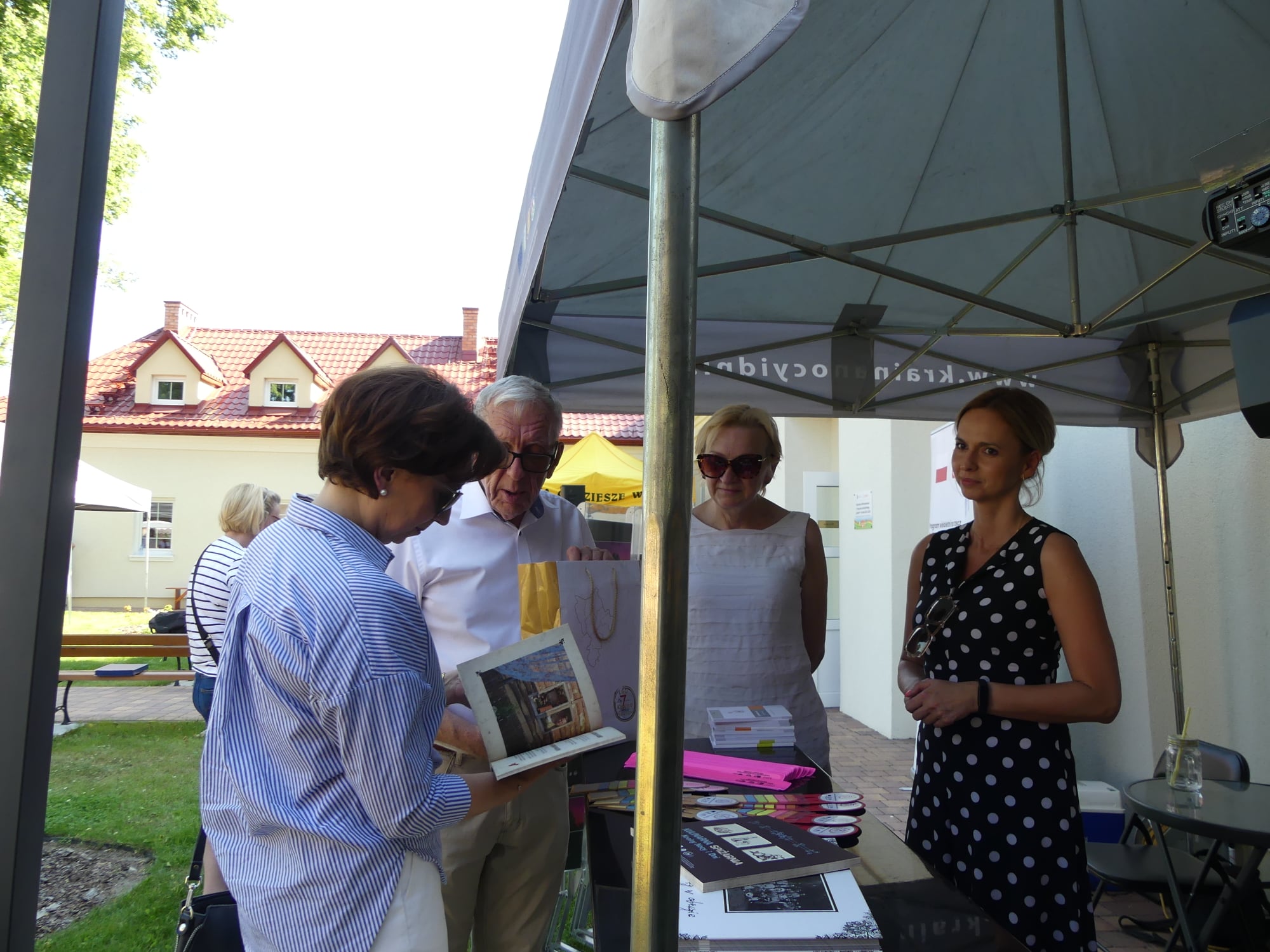 Od lewej strony Pani Marlena Maląg – Minister Rodziny i Polityki Społecznej, Józef Podłużny – Wójt Gminy Godziesze Wielkie, Alicja Jędrasiewicz – Zastępca Wójta Gminy oraz Kamila Pawlak - Dyrektor Biura LGD-7 "Kraina Nocy i Dni" przy stoisku LGD-7 „Kraina Nocy i Dni”.