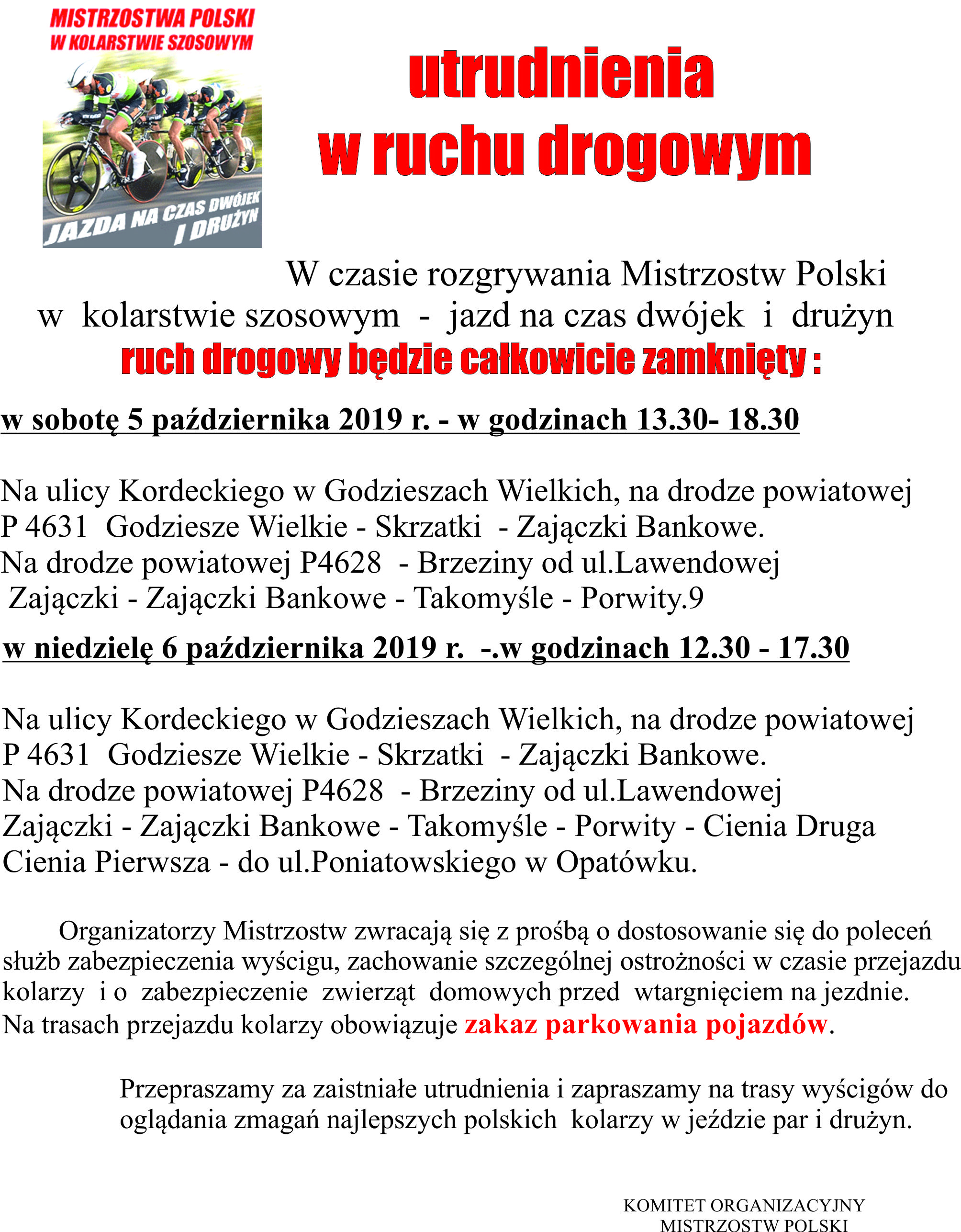5-6 października 2019 r - utrudnienia w ruchu drogowym w związku z Mistrzostwami Polski w kolarstwie soszowym
