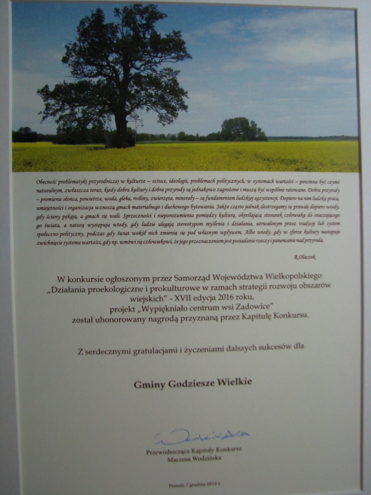 Zgłoszony projekt „Wypiękniało centrum wsi Zadowice" zyskał bardzo wysoką ocenę Kapituły konkursu i został nagrodzony podczas Gali Konkursu w dniu 7 grudnia 2016 roku.