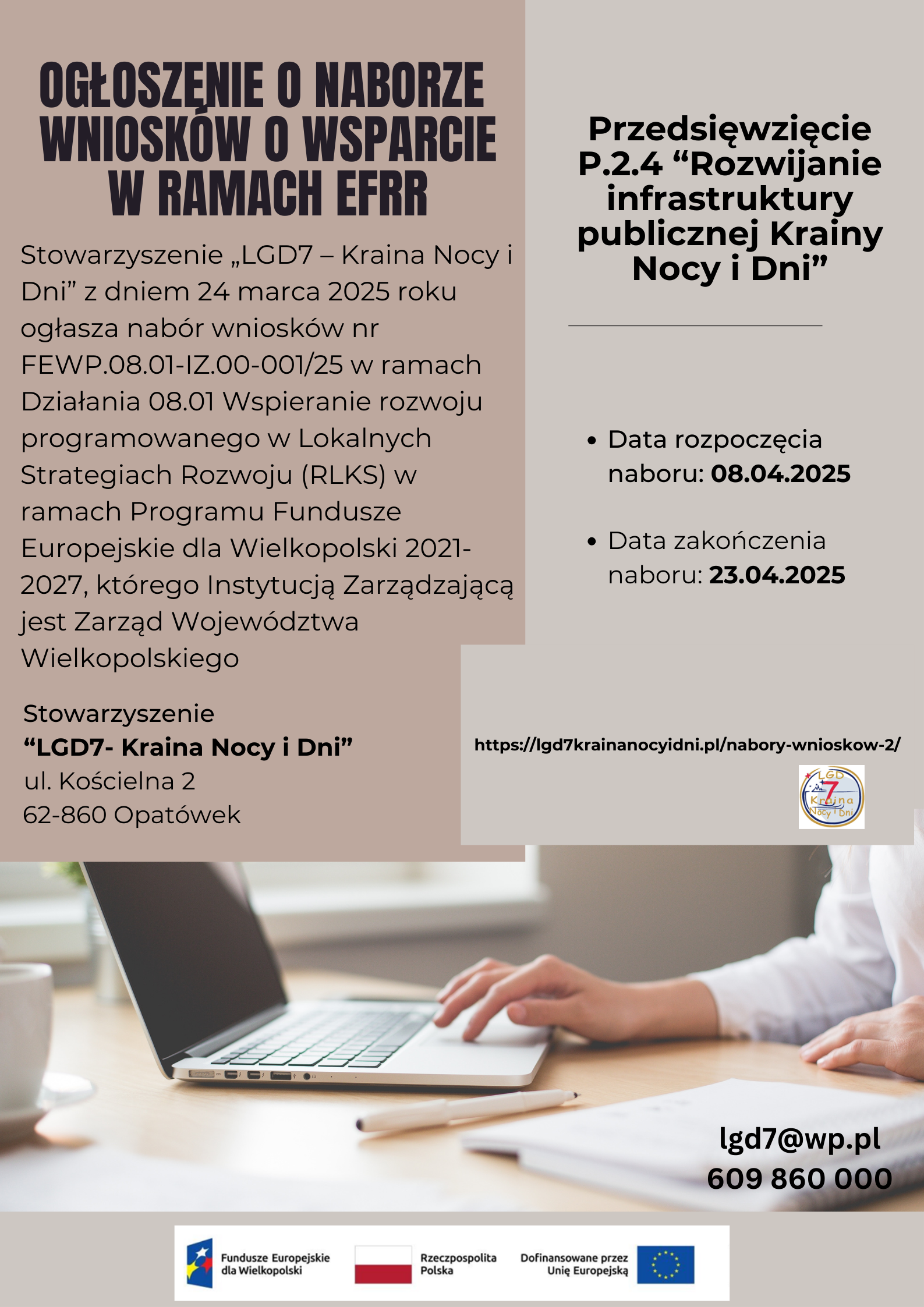 Stowarzyszenie „LGD7 – Kraina Nocy i Dni” z dniem 24 marca 2025 roku ogłasza nabór wniosków nr FEWP.08.01-IZ.00-001/25 w zakresie Działania 08.01 Wspieranie rozwoju programowanego w Lokalnych Strategiach Rozwoju (RLKS) w ramach Programu Fundusze Europejskie dla Wielkopolski 2021-2027