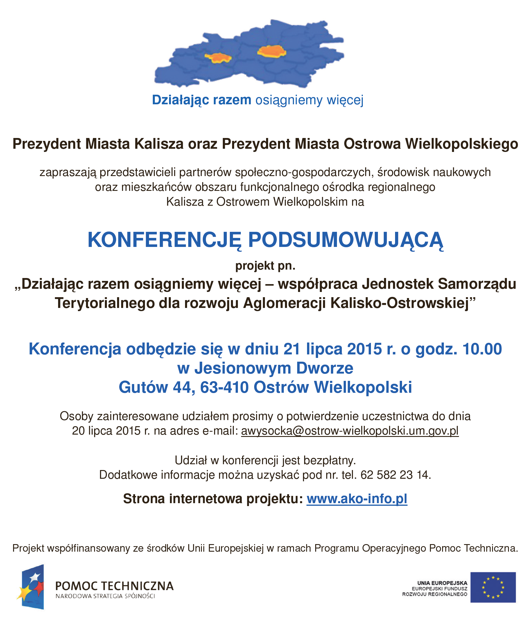 Konferencja podsumowująca projekt "Działając razem osiągniemy więcej - współpraca Jednostek Samorządu Terytorialnego dla rozwoju Aglomeracji Kalisko - Ostrowskiej" Program konferencji Szczegóły publikacji Wprowadzenie informacji: Mirosława Kubacka Data wprowadzenia: 2015-07-17 09:11 Ostatnia modyfikacja: Mirosława Kubacka Data ostatniej modyfikacji: 2015-07-17 09:16 Odsłon: 433