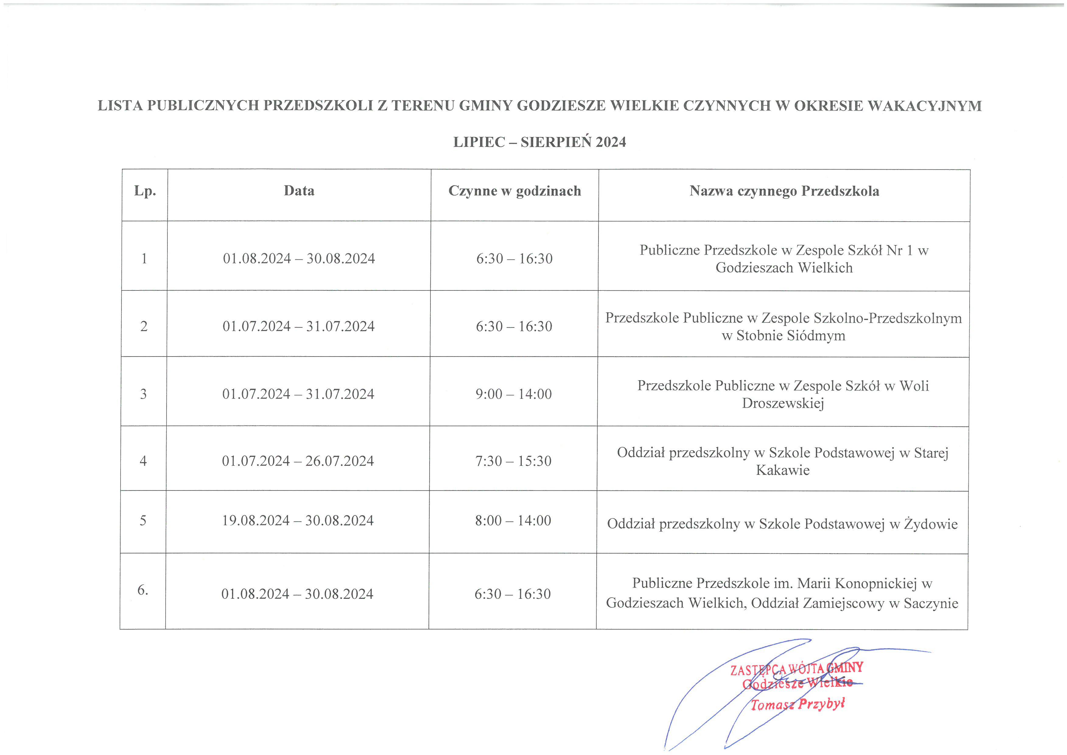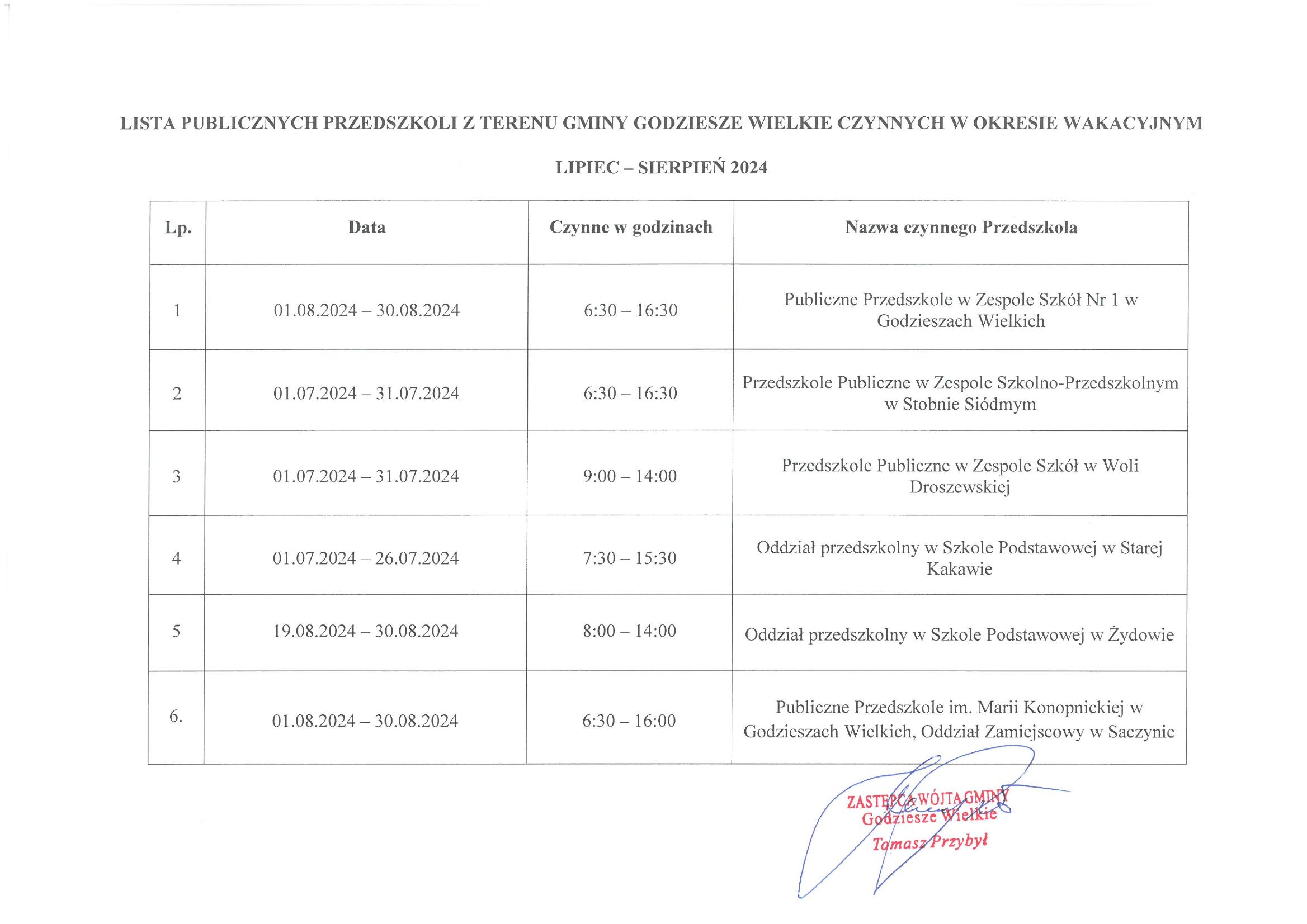 Lista publicznych przedszkoli z terenu Gminy Godziesze Wielkie czynnych w okresie wakacyjnym lipiec - sierpień 2024 (Pdf)