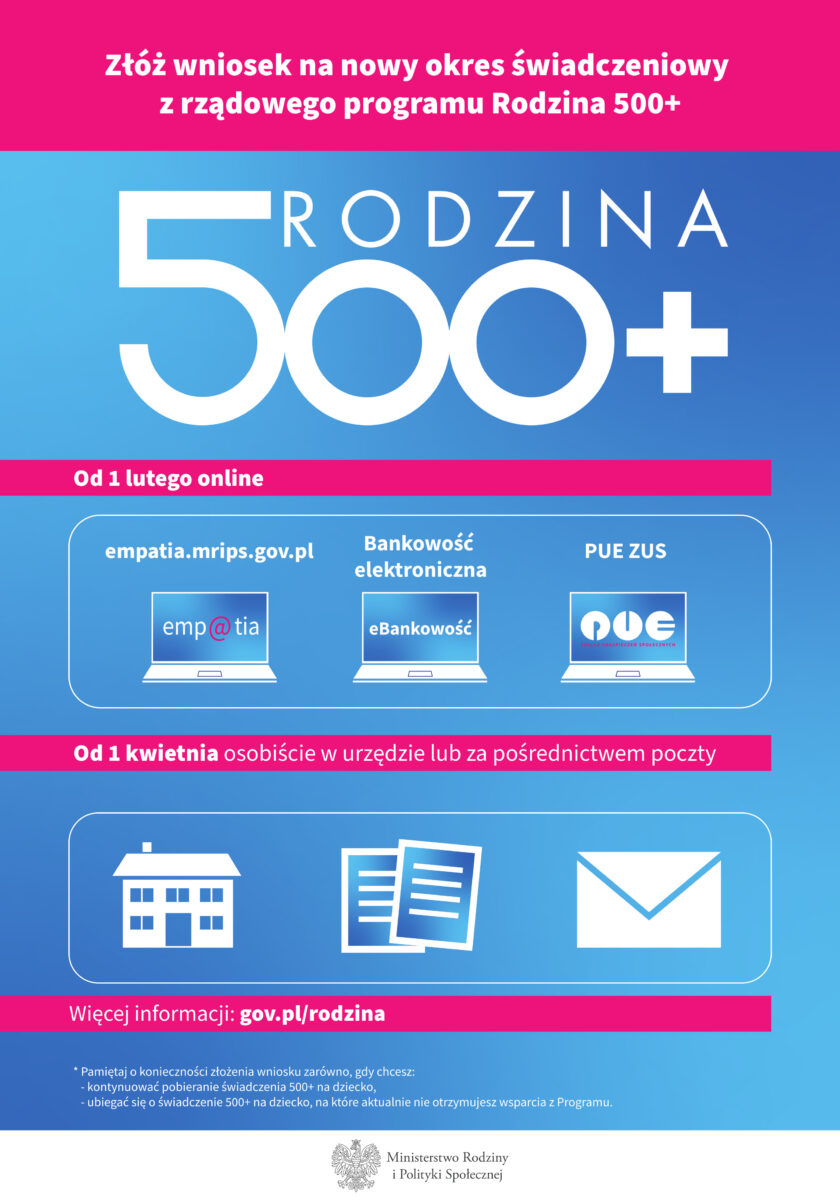Nabór wniosków o przyznanie świadczenia wychowawczego w ramach programu Rodzina 500 plus Najważniejsze informacje o rządowym programie „Rodzina 500+” Krótki informator Szczegóły publikacji Wprowadzenie informacji: Mirosława Kubacka Data wprowadzenia: 2021-02-02 18:05 Ostatnia modyfikacja: Mirosława Kubacka Data ostatniej modyfikacji: 2021-02-02 18:25 Odsłon: 340 Wytworzenie informacji: Jacek Mruczyk - Starszy Specjalista Oddział Nadzoru i Kontroli w Pomocy Społecznej, Wydział Polityki Społecznej Wielkopolski Urząd Wojewódzki w Poznaniu