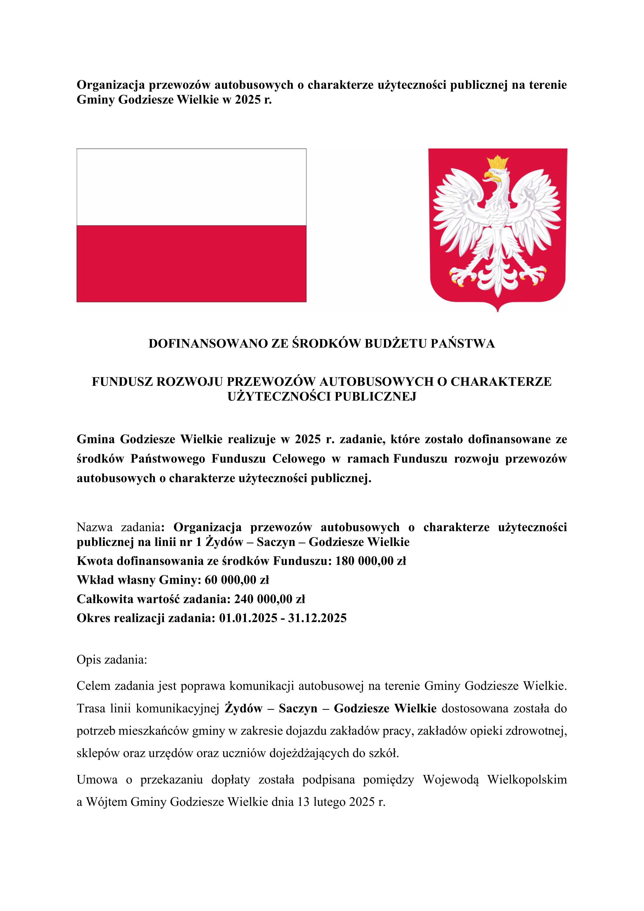 Organizacja przewozów autobusowych o charakterze użyteczności publicznej na terenie Gminy Godziesze Wielkie w 2025 r. Organizacja przewozów autobusowych o charakterze użyteczności publicznej na terenie Gminy Godziesze Wielkie w 2025 r. Szczegóły publikacji Wprowadzenie informacji: Angelika Antczak-Saeed Data wprowadzenia: 2025-02-14 13:45 Ostatnia modyfikacja: Angelika Antczak-Saeed Data ostatniej modyfikacji: 2025-02-14 13:45 Odsłon: 444 Wytworzenie informacji: Magdalena Dziwińska