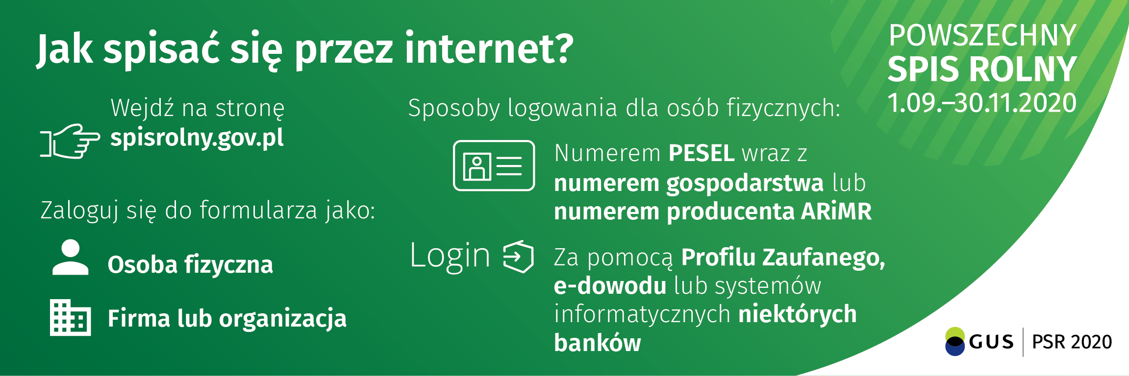 - wskazać czy prowadzi się gospodarstwo jako osoba fizyczna czy jako firma lub organizacja - od tego zależy bowiem sposób logowania. Użytkownik gospodarstwa indywidualnego może się zalogować podając swój PESEL oraz jeden z numerów identyfikacyjnych wykorzystywanych w systemach administracji publicznej (numer gospodarstwa rolnego wydrukowany w liście informacyjnym Prezesa GUS lub numer identyfikacyjny w ewidencji producentów ARIMR), przy tym użytkownik sam decyduje, który z numerów identyfikacyjnych wykorzysta do logowania w aplikacji samospisu. Można też skorzystać z usługi krajowego węzła identyfikacji elektronicznej i zalogować się poprzez: Profil Zaufany, e-dowód lub konta niektórych banków. Ważne by wybrać najwygodniejszą dla nas formę logowania już za pierwszym razem, bowiem jeśli przerwiemy wypełnianie formularza, ponowne logowanie odbędzie się tą samą drogą. Firmy lub organizacje wykorzystują do logowania w aplikacji spisowej swój identyfikator i hasło z portalu sprawozdawczego GUS.