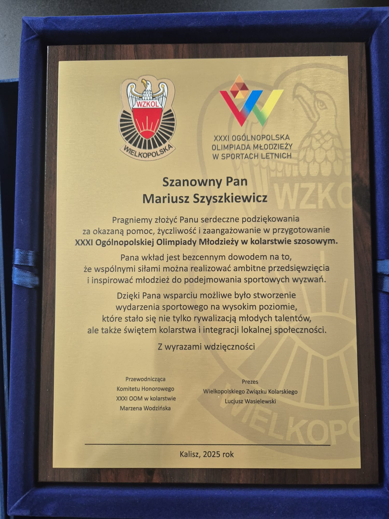 Na ręce Pana Wójta przekazano podziękowania dla całej Gminy Godziesze Wielkie za wieloletnią pomoc w realizacji przedsięwzięć sportowych. Zawody tego typu odbywają się na terenie naszej gminy już od kilkunastu lat, co przyczynia się do rozwoju sportu oraz integracji lokalnej społeczności.