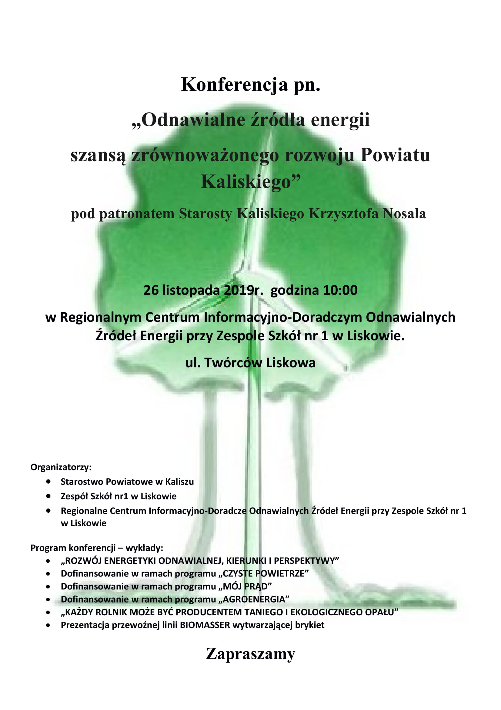 Zaproszenie do udziału w konferencji pn „Odnawialne źródła energii szansą zrównoważonego rozwoju Powiatu Kaliskiego”