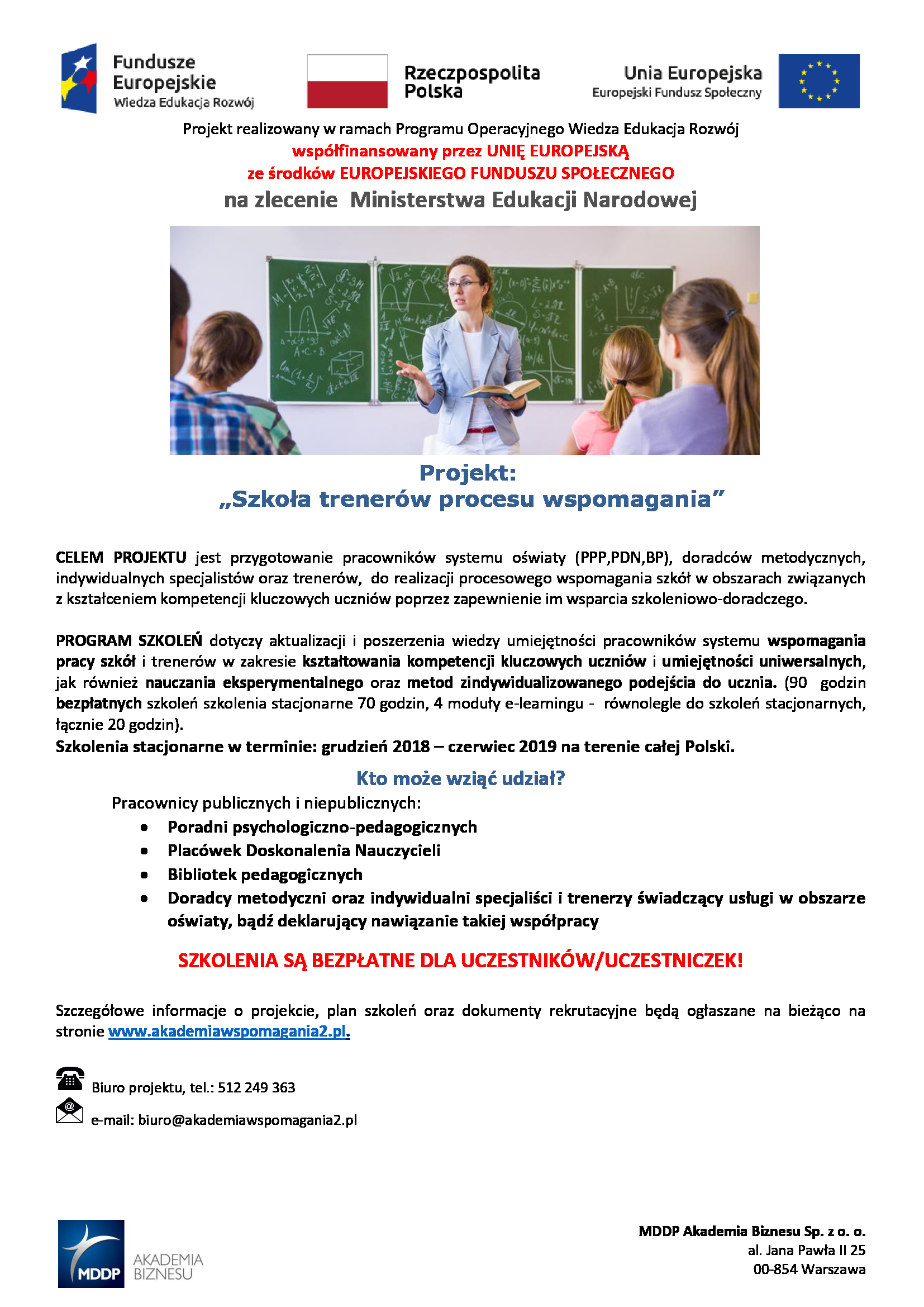 MDDP Akademia Biznesu zaprasza do wzięcia udziału w Projekcie „Szkoła Trenerów Procesu Wspomagania” realizowanym w ramach projektu konkursowego Ministerstwa Edukacji Narodowej w ramach Programu Operacyjnego Wiedza Edukacja Rozwój (PO WER) 2014-2020.