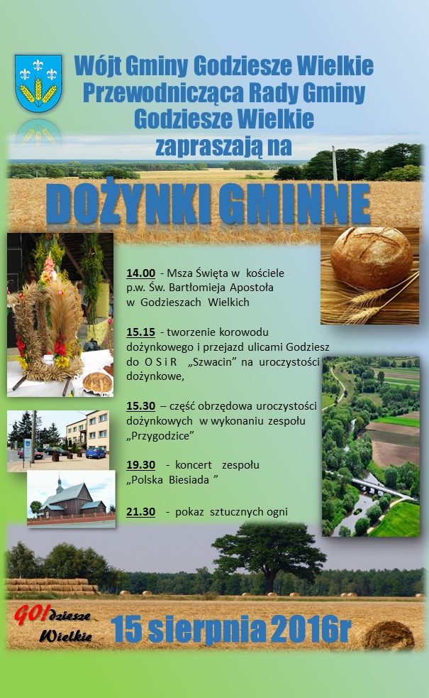ZAPROSZENIE NA DOŻYNKI GMINNE Szczegóły publikacji Wprowadzenie informacji: Anna Biernat Data wprowadzenia: 2016-08-05 09:18 Ostatnia modyfikacja: Anna Biernat Data ostatniej modyfikacji: 2016-08-05 12:51 Odsłon: 336