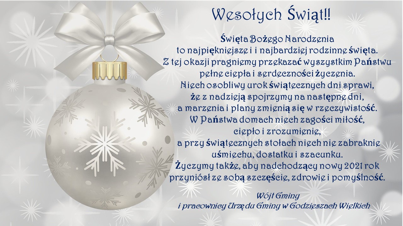 Życzenia Bożonarodzeniowe Szczegóły publikacji Wprowadzenie informacji: Angelika Antczak-Saeed Data wprowadzenia: 2020-12-22 08:23 Ostatnia modyfikacja: Angelika Antczak-Saeed Data ostatniej modyfikacji: 2020-12-22 08:47 Odsłon: 462