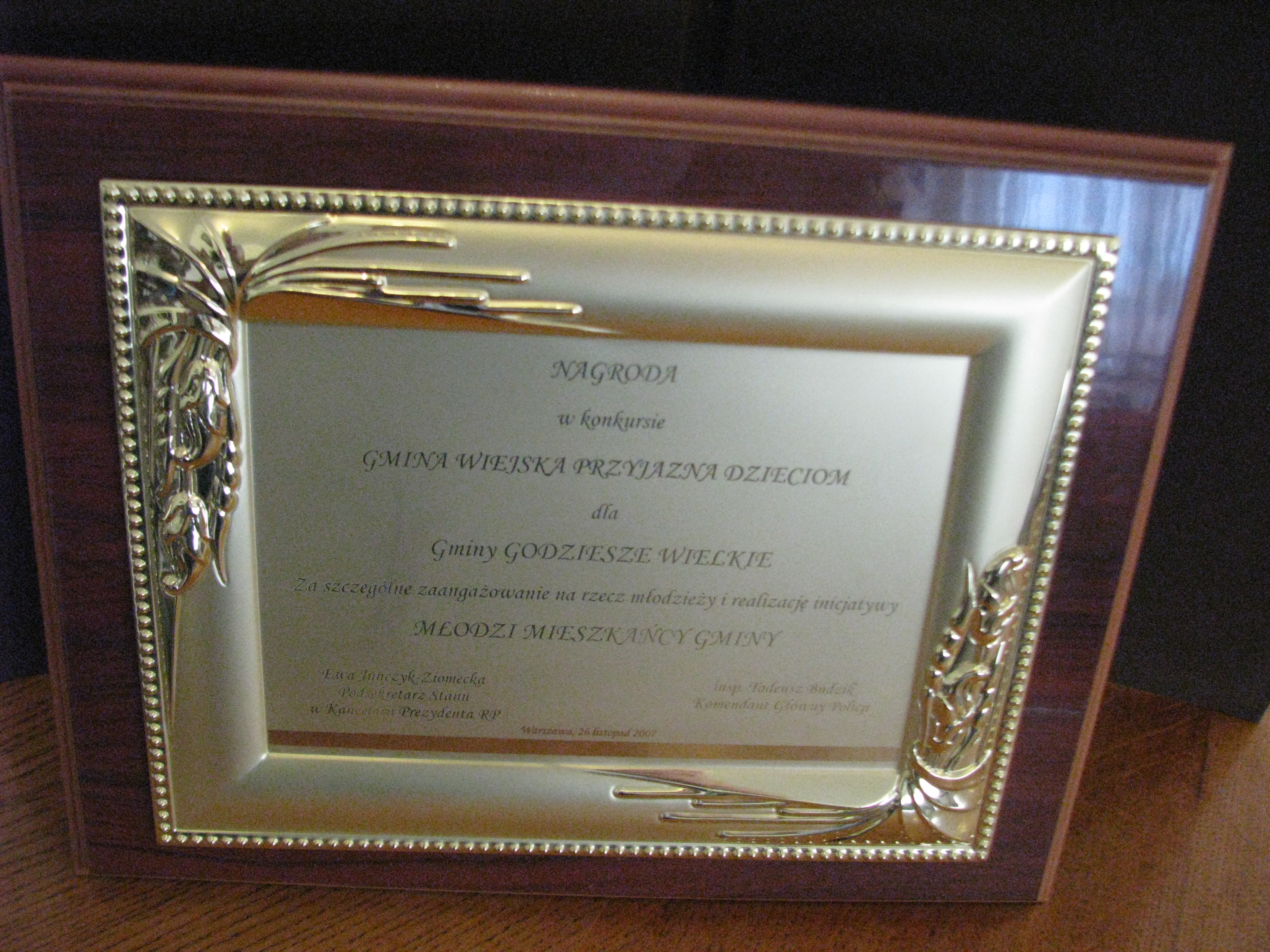 1) Nagrody w konkursie „Gmina wiejska przyjazna dzieciom” przyznana naszej Gminnie przez Kancelarię Prezydenta Rzeczypospolitej Polskiej w dniu 26 listopada 2007 roku.