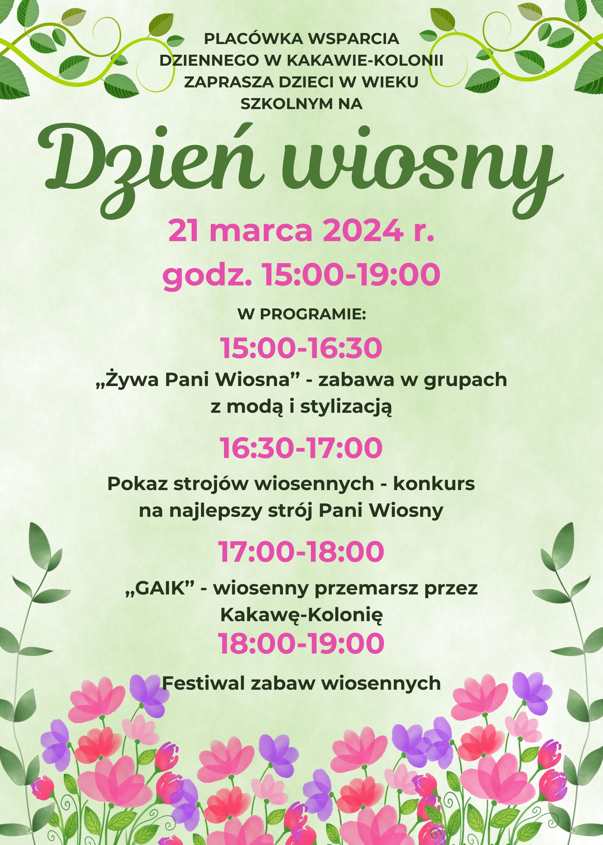 Placówka Wsparcia Dziennego w Kakawie-Kolonii pragnie serdecznie zaprosić dzieci w wieku szkolnym na Dzień Wiosny - 21 marca 2024 r. godz. 15:00 - 19:00.