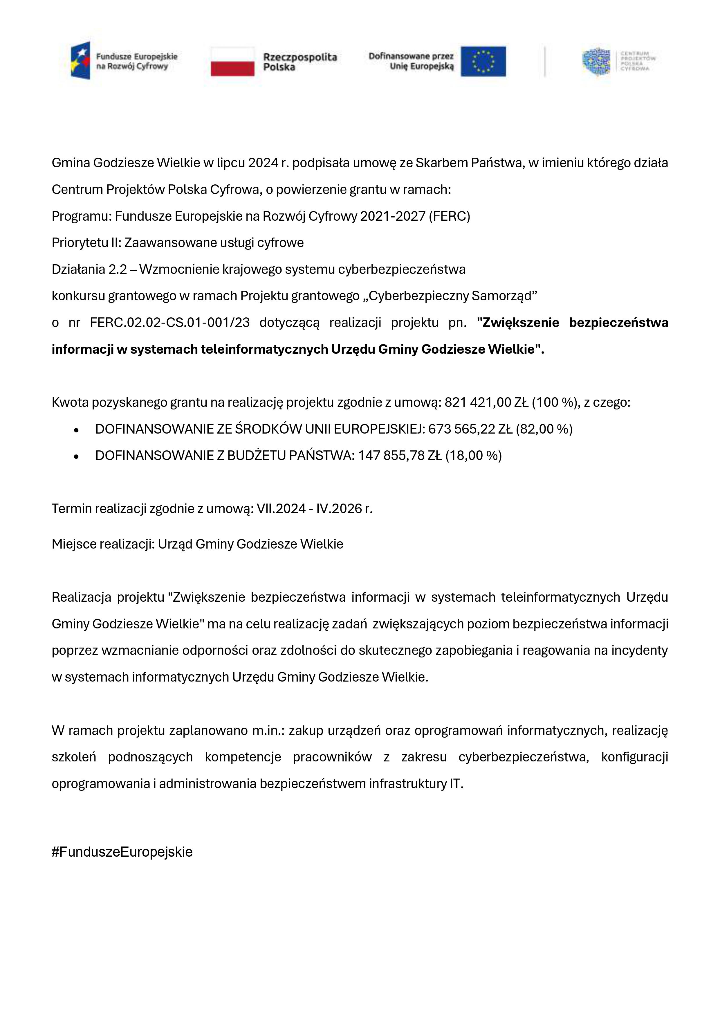 Gmina Godziesze Wielkie realizuje projekt pn. "Zwiększenie bezpieczeństwa informacji w systemach teleinformatycznych Urzędu Gminy Godziesze Wielkie"